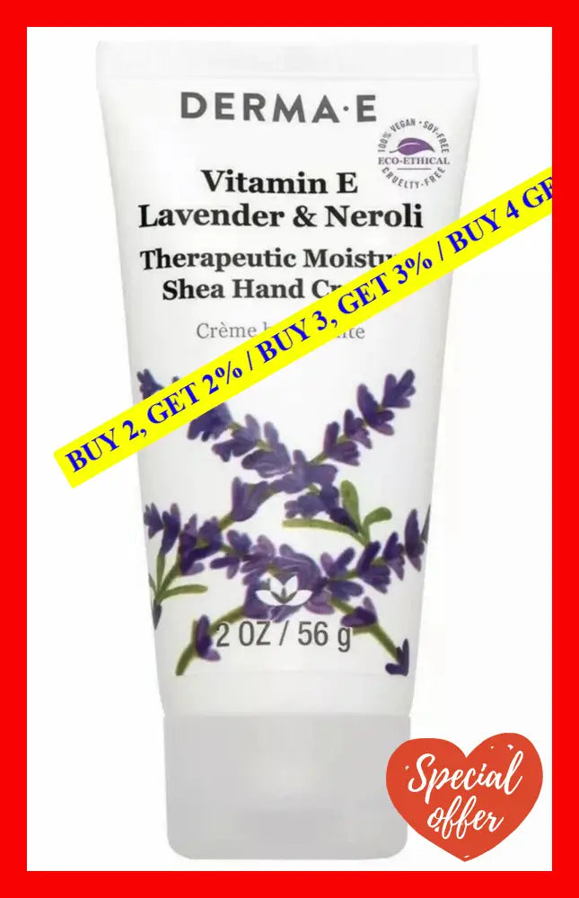 Derma-E's Vitamin E Skin Smoothing Shea Hand Cream is an exceptional solution for maintaining soft and nourished hands. This hand cream is blended with Lavender and Neroli extracts to offer a soothing and pleasant fragrance that lingers on your skin for a long time. The invaluable ingredients, Vitamin E and Shea Butter, effectively lock-in moisture, prevent cracking and dryness, and form a protective barrier to shield hands from harmful environmental stressors. The heavy-duty hydrating formula is ideal for people with parched and dehydrated skin.\n\nThe 2 oz. bottle of Derma-E's Vitamin E Skin Smoothing Shea Hand Cream is infused with natural botanicals and antioxidants to rejuvenate and soothe chapped hands from inside-out. This hand cream is suitable for all skin types and is unisex. The Lavender and Neroli extracts calm your senses and nourish your skin. It is free from sulfates, parabens, and any other harmful chemicals, making it safe for all age groups. The cream is cruelty-free and vegan, which means it has not been tested on animals and is free from animal derivatives. Use this Vitamin E Skin Smoothing Shea Hand Cream from Derma-E to transform your dry and cracked hands into velvety-smooth and soft hands that you'll love.