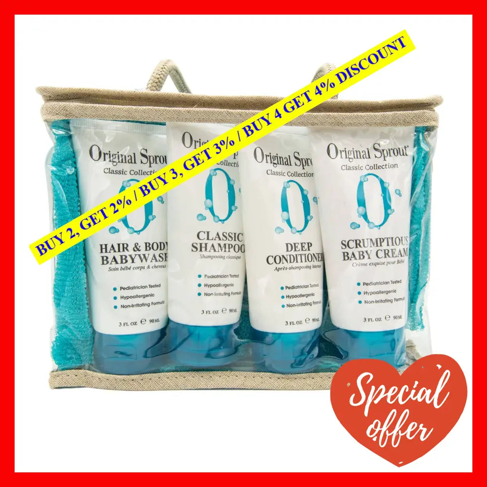 Introducing the Original Sprout Deluxe Kit for Kids - the ultimate solution for your child's hair and body needs! This 5-piece kit includes 3oz Natural Shampoo, 3oz Hair Body Baby Wash, 3oz Scrumptious Baby Cream, 3oz Deep Conditioner, and an exfoliating washcloth. Made with only the finest natural ingredients, this kit is perfect for little ones with sensitive skin.