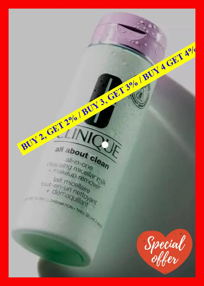 Introducing Clinique's All About Clean All-In-One Cleansing Micellar Milk and Makeup Remover, specially formulated for dry skin. This gentle and effective cleanser lifts away dirt, oil, and even the toughest makeup, leaving your skin feeling refreshed and nourished.