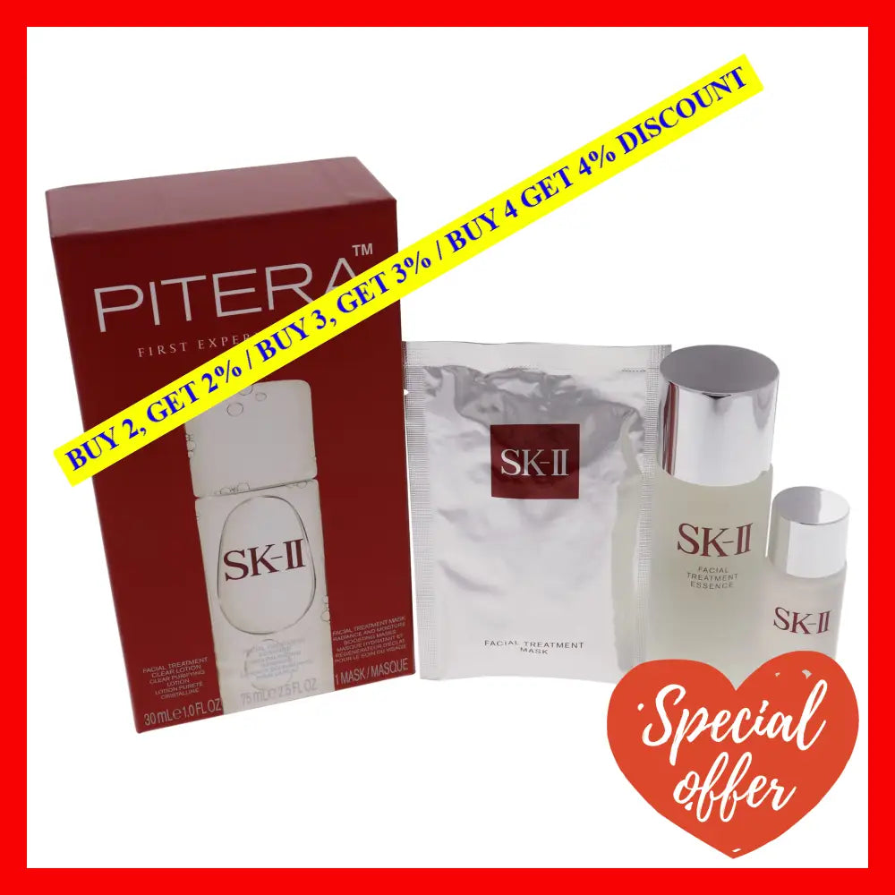 Introducing the Pitera First Experience Kit by SK-II, the ultimate skincare package for both men and women. This incredible 3-piece set includes a 2.5oz Facial Treatment Essence, 1oz of Facial Treatment Clear Lotion, and 1pc of the Facial Treatment Mask, all designed to give you a refreshing and youthful appearance.