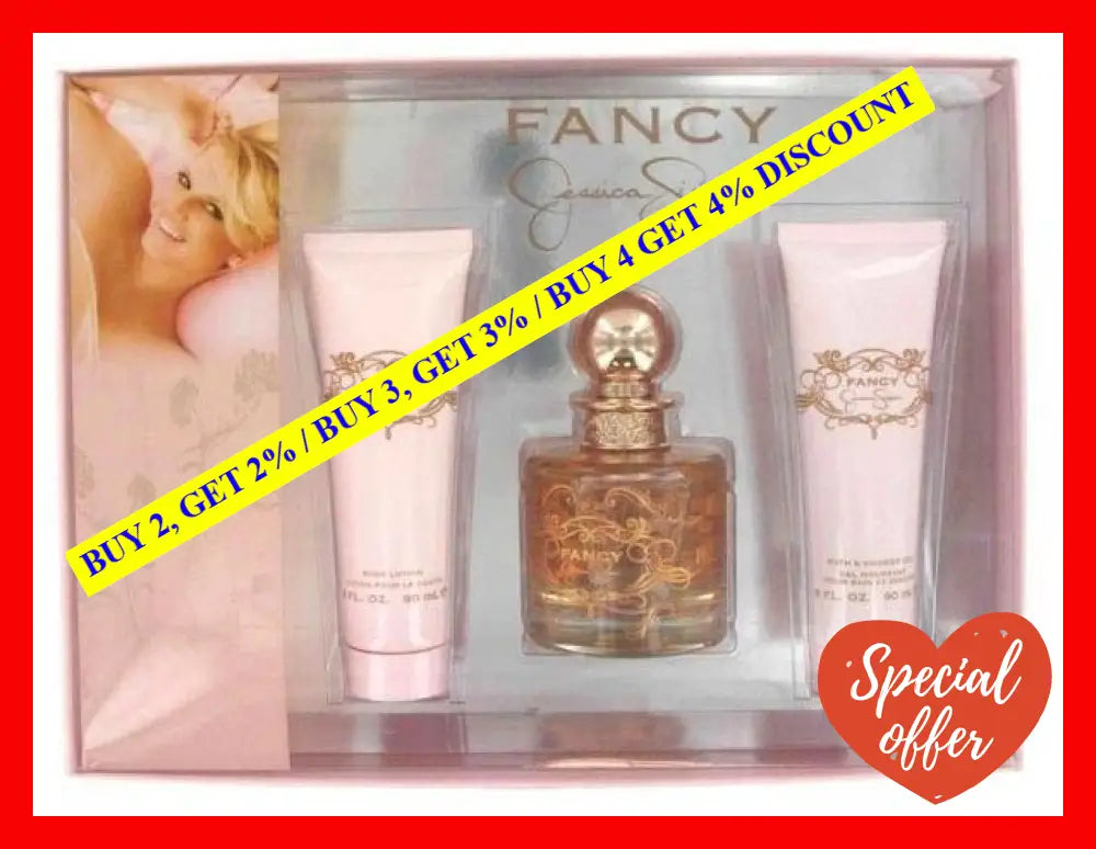 Introducing 'Fancy' by Jessica Simpson, a stunning fragrance that captures the essence of femininity and elegance. Delight your senses with this 3-piece gift set, which includes a 3.4oz Eau de Parfum spray, a 3oz body lotion, and a 3oz bath & shower gel.