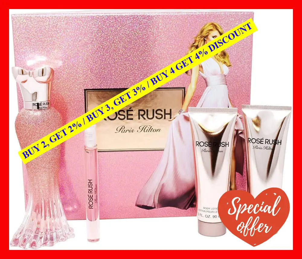 Rose Rush is a delightful scent created by Paris Hilton, intended solely for women. This exquisite 4-piece gift set consists of a 3.4-ounce Eau de Parfum Spray, a 3.0-ounce Body Lotion, a 3.0-ounce Shower Gel, and a 0.33-ounce Eau de Parfum Spray. This fragrance is a perfect choice for women who crave a refreshing fragrance that is both floral and sweet.