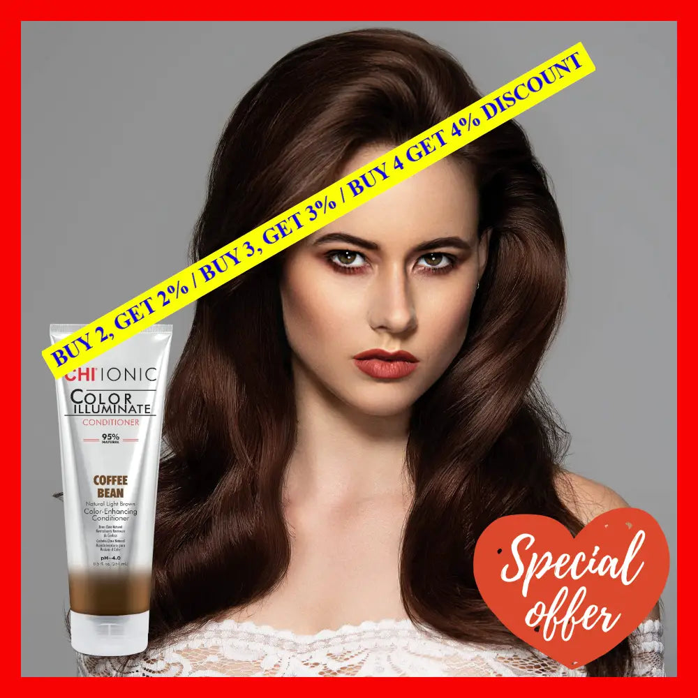Introducing Ionic Color Illuminate Conditioner - Coffee Bean by CHI, an exclusive hair care product designed to rejuvenate and protect your color-treated hair. This nutrient-rich formula is infused with natural ingredients like pea protein, silk and aloe vera that provide essential nourishment to your locks.