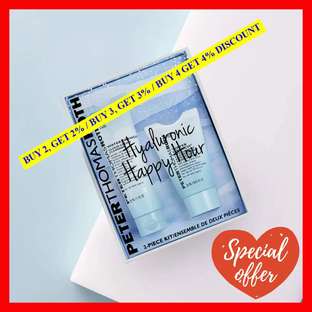 Introducing the Peter Thomas Roth Hyaluronic Happy Hour 2 Pc Kit ?your passport to hydrated and youthful-looking skin! This delightful bundle includes two powerful products designed to quench your skin's thirst and enhance its natural radiance.\n\nThe first star of this kit is the Water Drench Hyaluronic Cloud Cream Hydrating Moisturizer. Infused with a potent blend of hyaluronic acid and ceramides, this lightweight cream floods your skin with intense moisture, creating a reservoir that continuously hydrates throughout the day. As a result, your complexion appears plump, smooth, and incredibly supple. Perfect for all skin types, this nourishing moisturizer leaves no greasy residue and provides long-lasting hydration for a revitalized appearance.\n\nThe second gem in this kit is the Water Drench Hyaluronic Cloud Serum. Packed with 75% hyaluronic acid complex, this serum drenches your skin with a wave of pure hydration, restoring its natural moisture balance. It helps visibly plump the skin, reducing the appearance of fine lines and wrinkles. Additionally, it assists in locking in moisture, leaving your complexion looking refreshed and rejuvenated.\n\nSuitable for all ages, this Hyaluronic Happy Hour 2 Pc Kit delivers a powerful hydrating punch for a youthful and healthy complexion. Experience the joy of hydrated skin with Peter Thomas Roth ?the ultimate solution for all your skincare needs. Say hello to happy, nourished, and radiant skin!