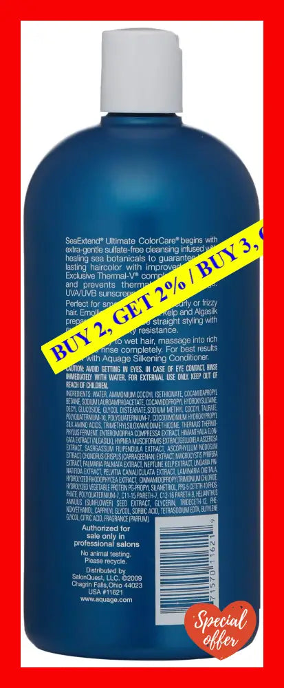 AQUAGE SeaExtend Silkening Shampoo is a luxurious shampoo with 33.8 oz of content that helps prevent color fading and thermal styling damage. It is ideal for all hair types and can be used regularly to maintain healthy, shiny, and silky hair. This shampoo is formulated with Thermal-V technology that seals heat out and prevents damage caused by thermal styling tools.