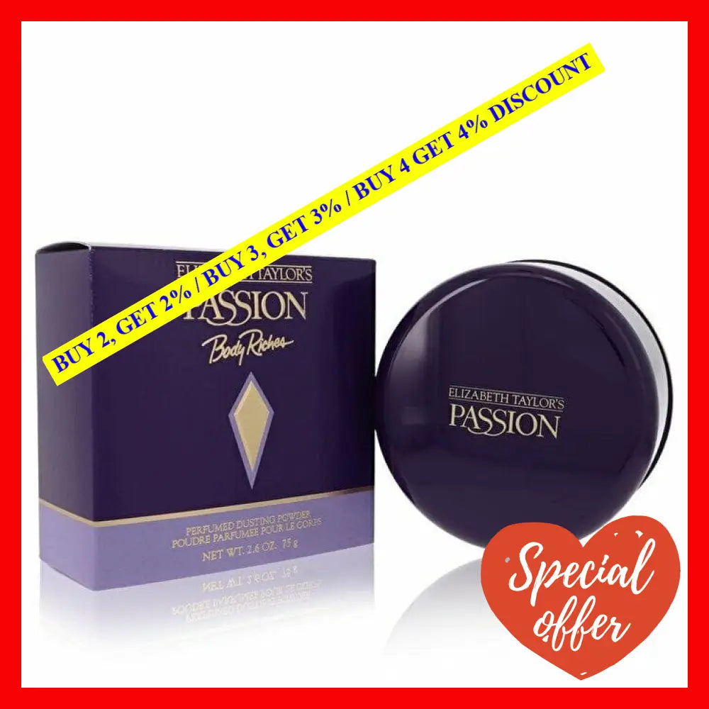 Experience the seductive and timeless scent of Passion by Elizabeth Taylor with this luxurious perfumed dusting powder. This 2.6 oz powder is delicately scented to leave your skin subtly fragranced and soft to touch.\n\nPassion by Elizabeth Taylor is a feminine and sensual fragrance that embodies the beauty and allure of women. The top notes of the fragrance are composed of coriander, Aldehydes, bergamot, and Brazilian rosewood. The heart of the scent is refined with notes of jasmine, carnation, and rose, while the base notes of sandalwood, patchouli, vanilla, and musk infuse a rich depth and warmth to the fragrance.\n\nThis perfumed dusting powder is perfect for layering the fragrance on your skin or as a standalone product to add a touch of elegance and luxury to your daily routine. It's gentle and mild formula makes it suitable for all skin types.\n\nThe product is packaged in an elegant powder box that is easy to use and perfect for traveling or adding to your vanity. The dusting powder has a subtle shimmer that adds a touch of glamour to your skin and gives you a radiant glow.\n\nIndulge in the luxurious scent of Passion by Elizabeth Taylor with this amazing perfumed dusting powder. It's a perfect addition to your beauty collection and a great gift for any woman who appreciates the finer things in life.
