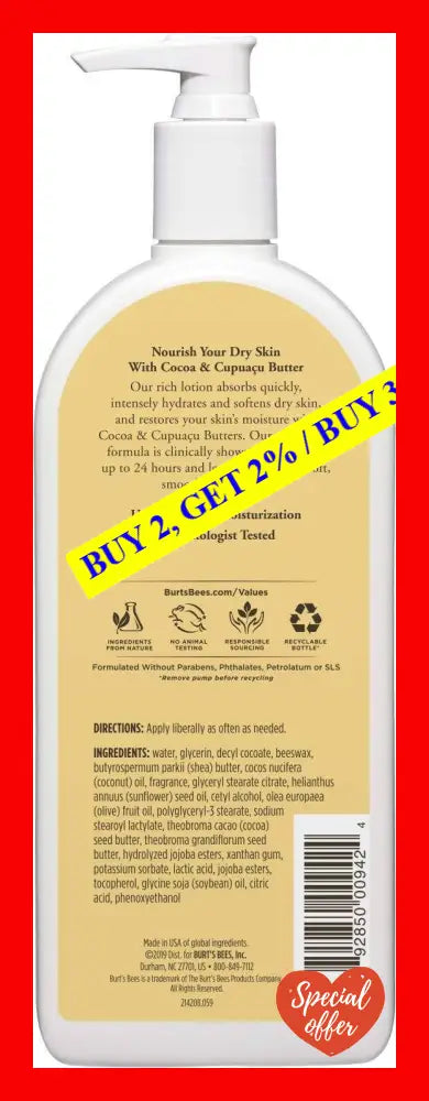 Introducing the Cocoa and Cupuacu Butters Body Lotion by Burt's Bees, a must-have skincare product designed for both men and women. This 12 oz body lotion provides deep hydration while nourishing your skin with its rich blend of natural ingredients.