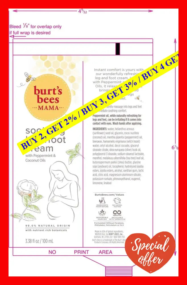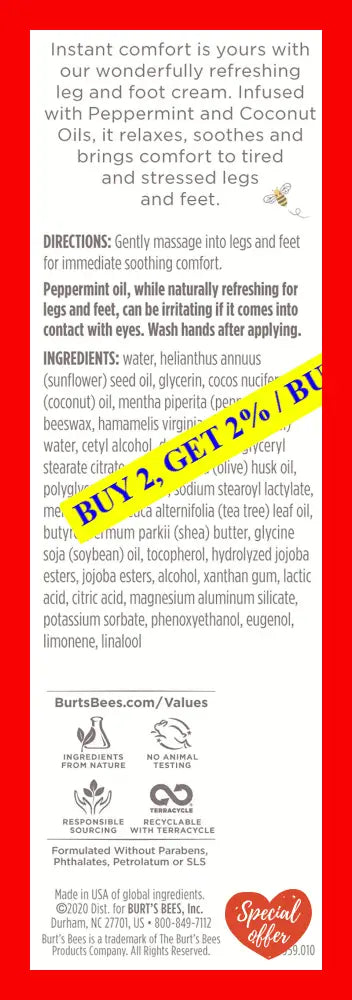 Mama Bee Leg and Foot Creme by Burts Bees for Women is an ultra-rich moisturizing cream that is specially formulated to soothe and hydrate tired, achy legs and feet. Made with natural ingredients like peppermint oil and rosemary extract, this cream provides a refreshing, cooling sensation that instantly relieves fatigue and stress in your legs and feet.