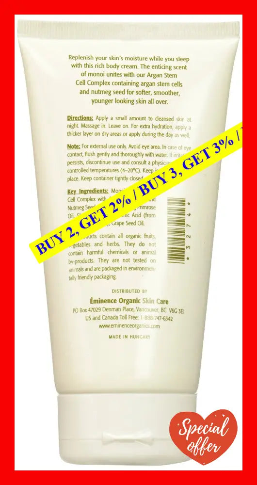 Introducing the Monoi Night Body Cream by Eminence ?a luxurious body cream specially formulated for overnight use to provide nourishing and rejuvenating benefits. This indulgent cream is perfect for both men and women, and comes in a generously sized 5 oz jar.