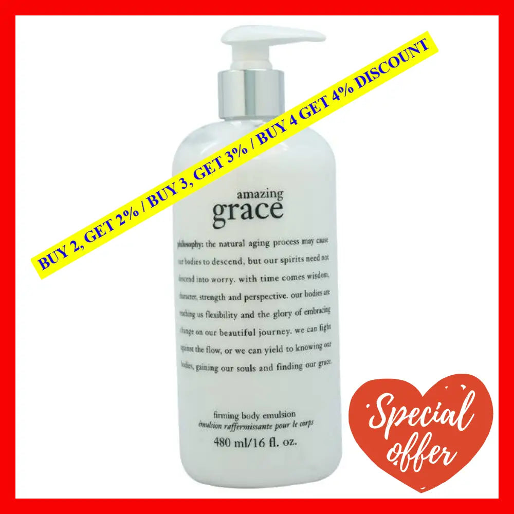 \nExperience the power of Amazing Grace Firming Body Emulsion by Philosophy. Treat yourself or someone special to this luxurious skincare essential, and revel in the pure elegance it provides. Its 16 oz size ensures long-lasting use, making it a great addition to any skincare routine. Say goodbye to dry, dull skin and say hello to a gracefully firm and radiant complexion!