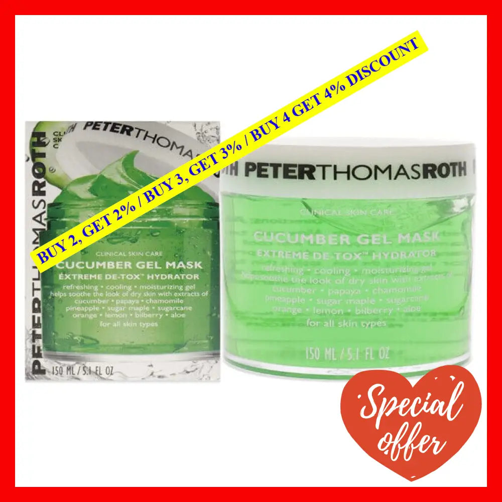 Introducing the Peter Thomas Roth Cucumber Gel Mask - your ultimate solution for extreme de-tox hydration and soothing troubled skin! This cooling and hydrating facial mask is specially formulated to provide a refreshing escape for dry and irritated skin.\n\nPacked with the power of cucumber extract, this 5 fl oz mask instantly revitalizes your skin, making it look and feel amazing. Cucumber is known for its natural ability to calm redness, reduce inflammation, and promote a well-hydrated complexion, leaving your skin looking brighter and healthier than ever before.\n\nThis innovative gel mask not only soothes your skin but also detoxifies it, helping to draw out impurities and unclog pores for a clearer complexion. With regular use, you'll notice a reduction in the appearance of dryness, fine lines, and wrinkles.\n\nSuitable for all age groups, this mask is incredibly easy to use. Simply apply a generous amount to your cleansed face and let it work its magic for 10 minutes. Then, rinse off with cool water to reveal skin that feels refreshed, hydrated, and rejuvenated.\n\nSay goodbye to dry and irritated skin with the Peter Thomas Roth Cucumber Gel Mask. Experience the amazing benefits of this hydrating facial mask and embrace a healthier, more radiant you.