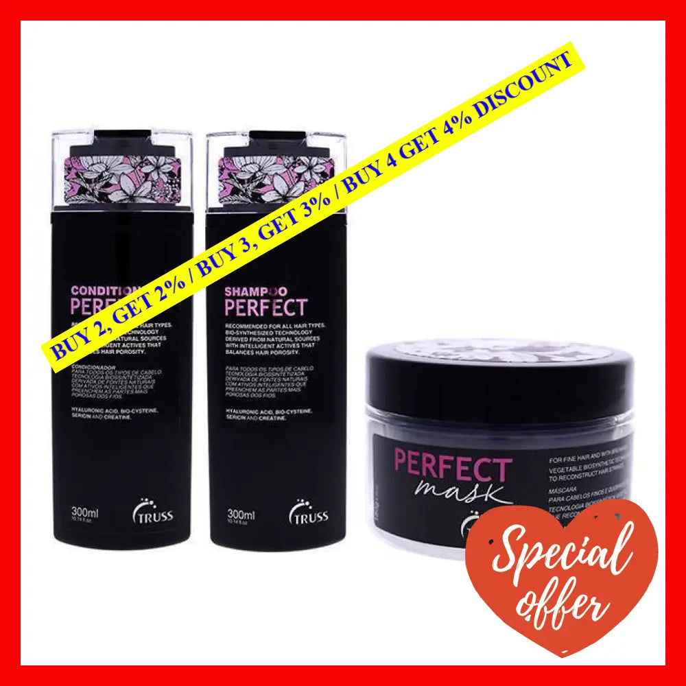 Introducing the Perfect Shampoo and Conditioner and Mask Kit by Truss, a complete hair care solution for both men and women. This 3-piece kit includes a 10.14 oz shampoo, 10.14 oz conditioner, and a 6.35 oz masque, providing you with everything you need to achieve perfect hair.