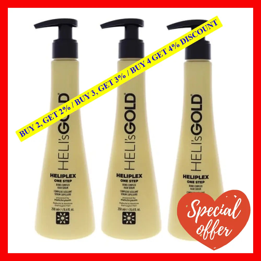 The Heliplex One Step Hair Serum by Helis Gold is an advanced hair care formula designed for both men and women. This hair serum comes in a pack of three, each containing 8.4 oz serum. The serum contains a blend of nourishing ingredients that work together to improve hair texture, reduce frizz, and add shine for a gorgeous, healthy-looking mane.\n\nThe serum is easy to use and requires only one step to get stunning hair. It is suitable for all hair types, including curly, straight, wavy, thick, or thin hair. The Heliplex One Step Hair Serum is lightweight, non-greasy, and quickly absorbs into the hair without leaving any residue.\n\nThis serum is formulated with a unique blend of proteins, vitamins, and essential oils that provide intense nourishment to the hair. It repairs damage caused due to heat styling, chemicals, and environmental factors. It also hydrates dry and brittle strands, making them softer, smoother, and more manageable.\n\nExperience the benefits of salon-quality hair with the Heliplex One Step Hair Serum. It protects your hair from UV rays, humidity, and pollution, ensuring your locks stay healthy and shiny all day long. Use it regularly for lustrous strands that are bound to turn heads.