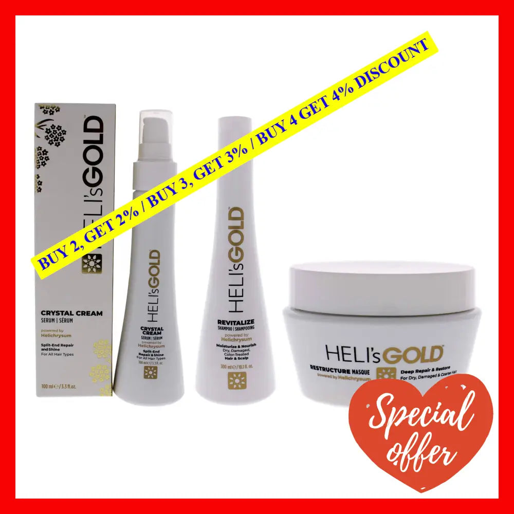Introducing the Revival Series Kit by Helis Gold, a must-have 3-piece set designed for both men and women. This remarkable kit includes a 3.3oz Crystal Cream Serum, a 10.1oz Revitalize Shampoo, and a 3.3oz Restructure Masque. Experience the ultimate haircare regime that will leave your locks looking healthy, vibrant, and full of life.