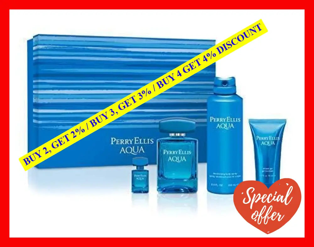 The Perry Ellis Aqua by Perry Ellis for Men is a 4-piece gift set that includes 3.4oz EDT Spray, 0.25oz EDT Spray, 6.8oz Deodorizing Body Spray, and 1.7oz Shower Gel. This fragrance is perfect for the modern man who is confident, charismatic, and loves to enjoy life to the fullest.\n\nThe top notes of this scent are a refreshing blend of lime, bergamot, and watery marine notes that give a natural aquatic aroma. The heart notes reveal a mix of lavender with coriander and geranium, giving it a mild floral scent. The base notes comprise of a mix of sandalwood, amber, and musk which lend a masculine touch to the overall fragrance.\n\nThe 4-piece set is perfect for men who love to feel fresh and clean throughout the day. The EDT spray and deodorizing body spray help to keep a refreshing fragrance all day long while the shower gel allows you to enjoy a relaxing bath to start your day off right.\n\nOverall, Perry Ellis Aqua by Perry Ellis is the perfect scent for men who want to stand out from the crowd in a subtle and sophisticated way. This gift set will make an excellent present for a loved one or yourself, and it? definitely worth your time and investment. Order now and experience the refreshing sensation that will keep you confident and lively all day long.