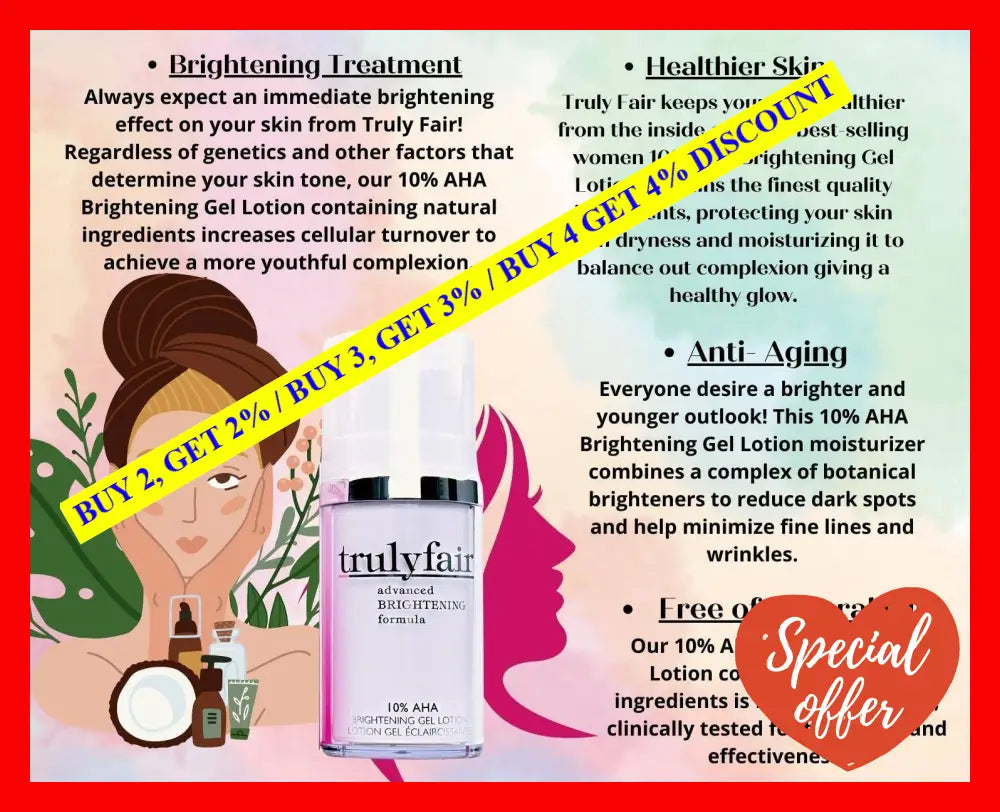 Get ready to experience a brighter, healthier-looking complexion with the 10 Percent AHA Brightening Gel Lotion by Truly Fair. Unleash your inner radiance and reveal the true beauty of your skin.