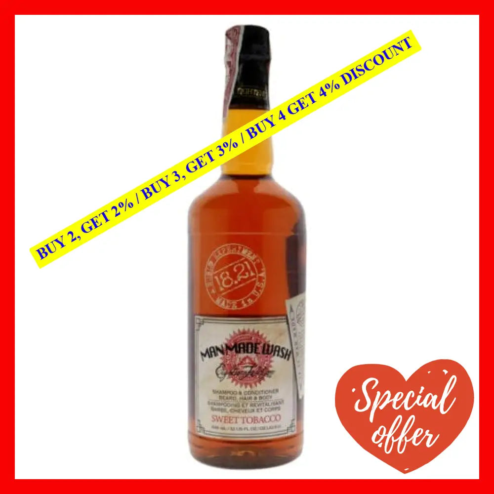 Introducing the Man Made Wash - Sweet Tobacco by 18.21 Man Made for Men - the ultimate 3-in-1 grooming product for men. This 32 oz bottle of goodness is a blend of shampoo, conditioner and body wash that is perfect for any man on-the-go.\n\nThe Sweet Tobacco scent adds a touch of elegance to your grooming routine. Indulge in a luxurious fragrance that exudes masculinity and confidence, and enjoy a long-lasting scent that will leave you feeling invigorated all day long.\n\nWith its rich lather, this triple-action formula gently cleanses and removes impurities from your hair and body while also providing intense hydration. Its deep conditioning properties nourish and protect hair from damage, leaving it looking and feeling strong and healthy.\n\nThis 3-in-1 grooming product is perfect for those who value convenience and quality. Whether you're hitting the gym, heading to work, or just want to smell good throughout the day, the Man Made Wash - Sweet Tobacco by 18.21 Man Made for Men is the perfect solution for all your grooming needs. Upgrade to this all-in-one product that is versatile, effective and smells great too!\n\nGet yours now and experience the ultimate grooming luxury today!