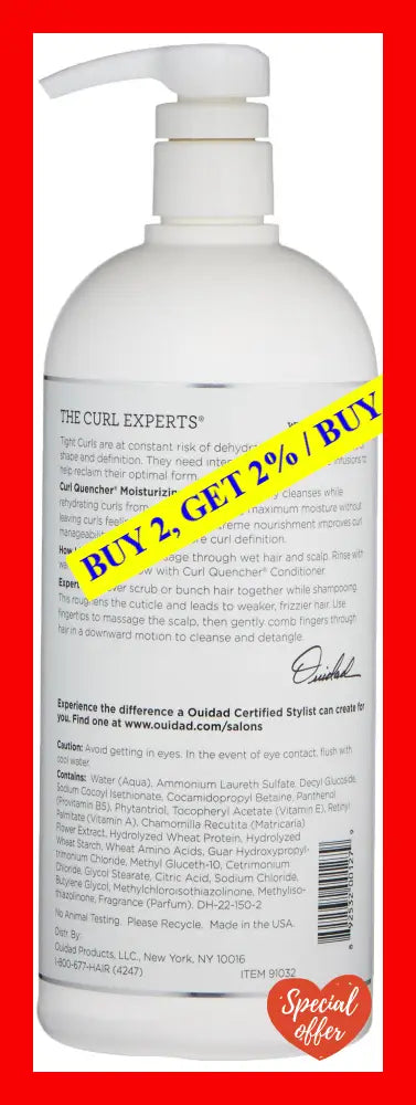 Curl Quencher Moisturizing Shampoo by Ouidad is a 33.8 oz. bottle of a great shampoo that guarantees to satisfy any unisex. This shampoo is ideal for individuals with curly hair that needs intense moisture and hydration. Ouidad has created a unique formula that effectively cleanses while also infusing the hair with the moisture it needs to combat frizz, tangling, and dryness.
