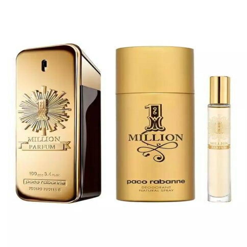 \nWhether you're heading to a business meeting, a romantic date, or simply want to feel your best, the Paco Rabanne One Million Parfum 3 Piece Set for Men is the perfect accessory. Embrace the opulence and elegance of this fragrance, leaving a lasting impression wherever you go. Treat yourself or surprise a special man in your life with this exquisite set and let the intoxicating scent speak for itself.