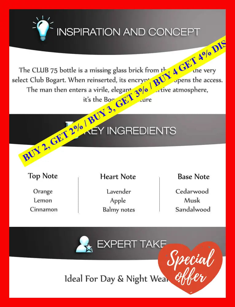 \nThe fragrance is perfect for men who want to stand out and leave a lasting impression. It is suitable for all occasions and can be worn both during the day and the night. Club 75 by Jacques Bogart for Men is a perfect blend of sophistication and adventure that will make you stand out from the crowd.