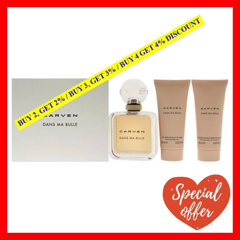 Introducing the Dans Ma Bulle by Carven for Women 3 Pc Gift Set, a delightful collection that will transport you into a world of pure bliss and serenity. This set includes a 3.3oz EDP Spray, 3.3oz Body Milk, and 3.3oz Shower Gel, all beautifully packaged for your enjoyment.