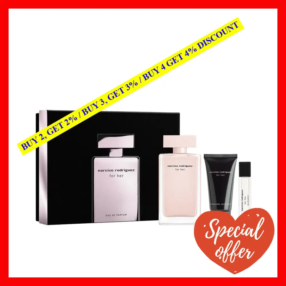 The Narciso Rodriguez by Narciso Rodriguez for Women 3 Pc Gift Set offers a delightful combination of fragrances and body care essentials. This set includes a generous 3.3oz Eau de Parfum (EDP) Spray, a convenient 0.33oz travel-sized EDP Spray, and a nourishing 2.5oz Body Lotion.