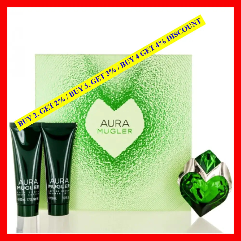 \nPlease note, the gift set may have imperfections in its outer packaging. However, rest assured that the products inside the box are impeccable and untouched. This makes the Aura Mugler Gift Set an ideal choice for those seeking a sublime fragrance experience at an exceptional value.