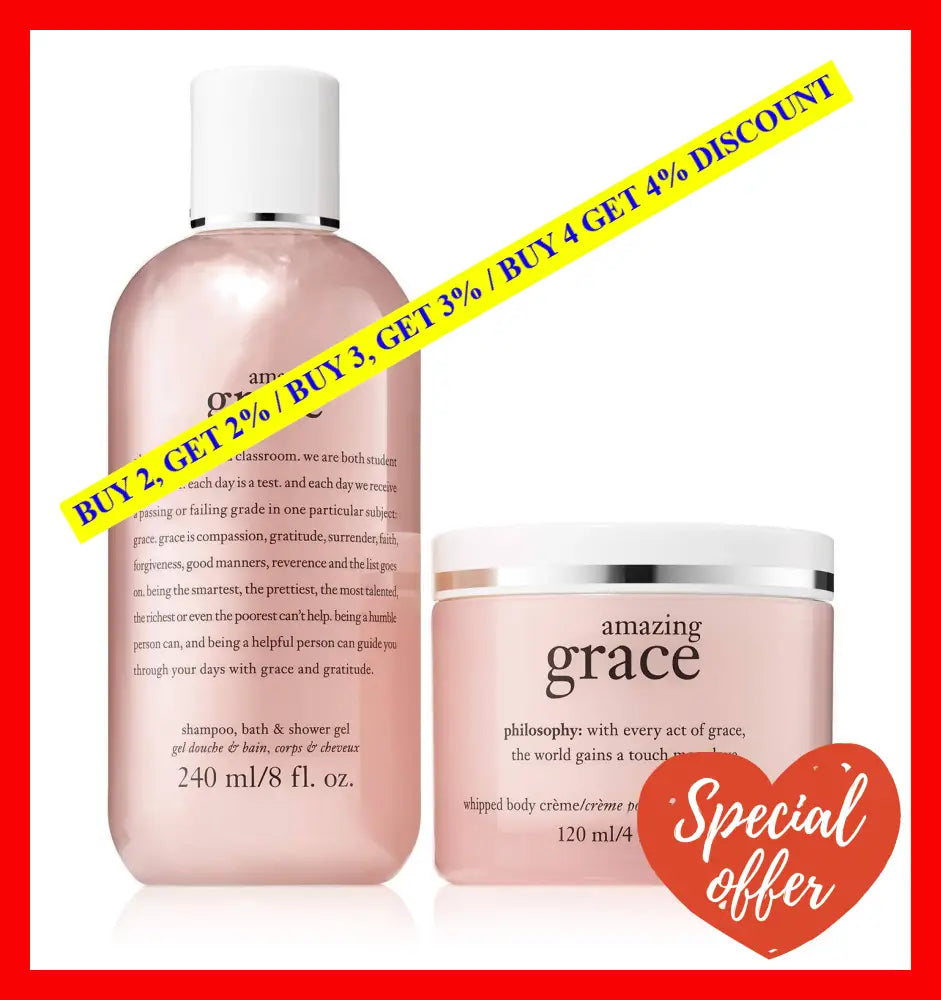 The 'You're Amazing' set by Philosophy for Women is an excellent choice for those who love to pamper themselves with luxurious body care products. This 2-piece set includes an 8 oz. bottle of shampoo, bath, and shower gel, and a 4 oz. jar of whipped body cr?e, both in the Amazing Grace scent.
