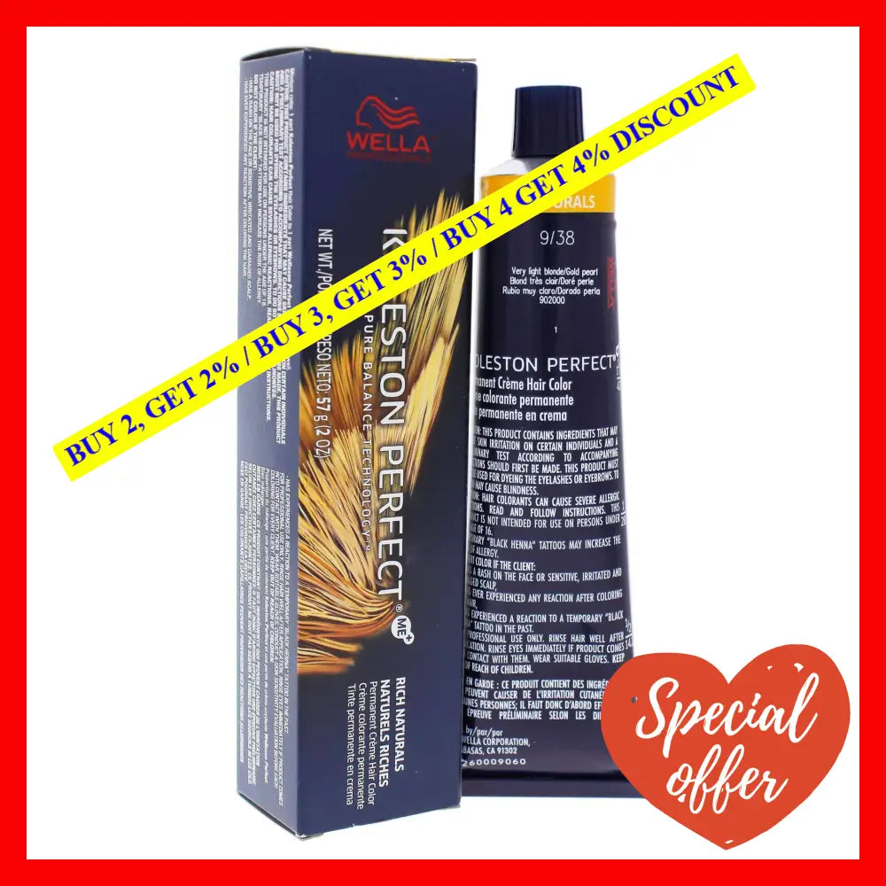 Koleston Perfect Permanent Creme Hair Color - 9 38 Very Light Blonde-Gold Pearl by Wella is a specially designed hair color that will give you an unbeatable salon-like finish at home. The formula is created with a special blend of ingredients that provides long-lasting, intense color results, perfect for enhancing the vibrancy of your hair. This hair color is perfect for both men and women; it is unisex and can be used on all hair types.