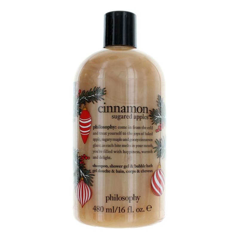 Introducing the delightful Cinnamon Sugared Apples by Philosophy! This 16 oz bottle contains a versatile product designed for women, serving as a shampoo, shower gel, and bubble bath in one. Immerse yourself in an invigorating shower experience or indulge in a luxurious bubble bath while enjoying the captivating scent of cinnamon sugared apples.