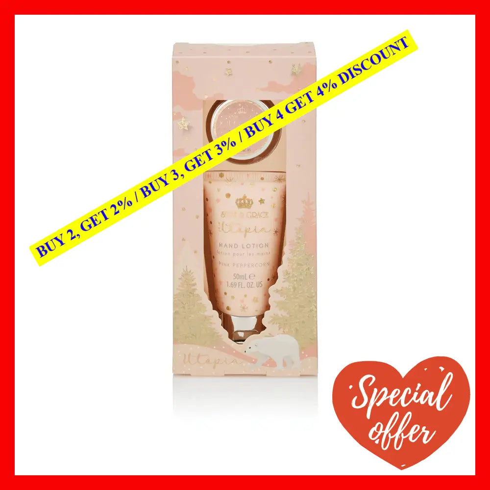 Introducing the Utopia Festive Rescue Set by Style and Grace, a delightful package designed to pamper women of all ages. This exquisite set includes a 1.7oz bottle of heavenly hand lotion and a convenient 10ml lip balm.