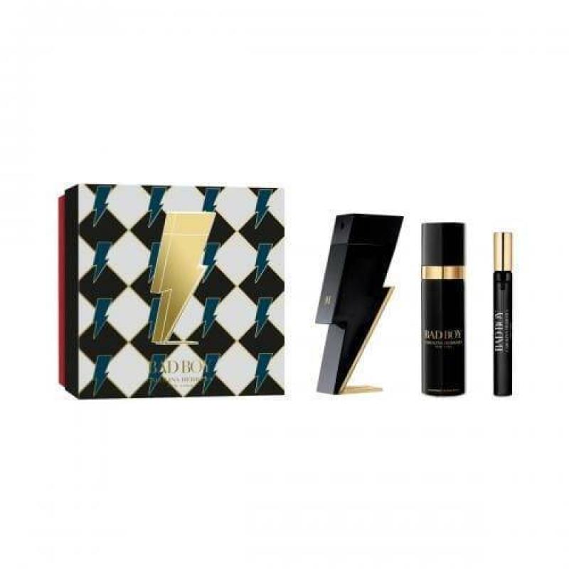\nThe centerpiece of this set is the Carolina Herrera Bad Boy Eau de Parfum, a dynamic fragrance that exudes strength and confidence. With its captivating blend of contrasting notes, this scent delivers a harmonious fusion of masculinity and sensuality. The top notes of black and white pepper create a fiery opening, while the heart notes of cedarwood and sage provide a woody and aromatic essence. Completing the fragrance are the base notes of tonka bean and amber, adding a warm and alluring touch.