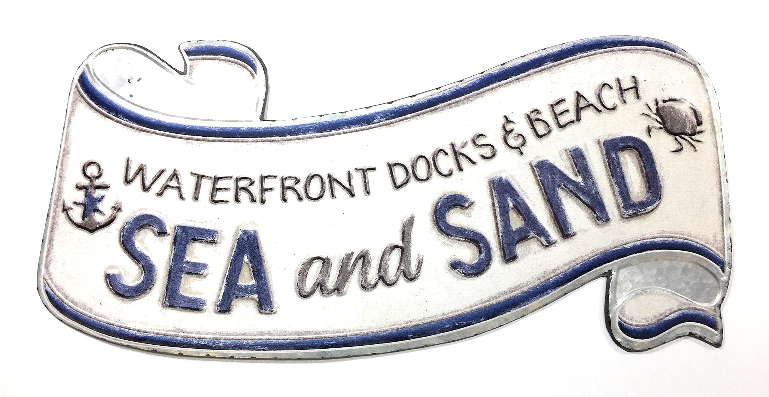 Waterfront Docks & Beach Sea And Sand. This embossed sign was crafted with high quality tin metal materials and painted to have a vintage distressed look and is fashioned into a scroll design. A show-stopping piece of decor perfect for a game room bar restaurant or basement. Hangs by two metal triangle hangers. Measurement: 24''W x 11¼''H