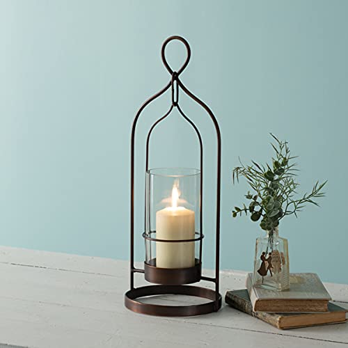 The Small Salvatore Lantern is a great way to make a statement in your home. Its elegant and bold design will have your guests in awe. It features a copper plated finish with an open area and glass chimney for a candle. The top features a hook for hanging. Chimney is 4'' dia. 8''H. Shown with a 3''x6'' pillar candle not included. SKU: 370529 Measurement: 7'' dia. x 20½''H UPC: 801106207283