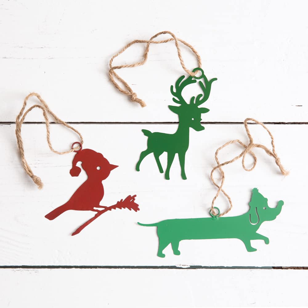 This playful set of holiday ornaments feature a songbird reindeer and dachshund.