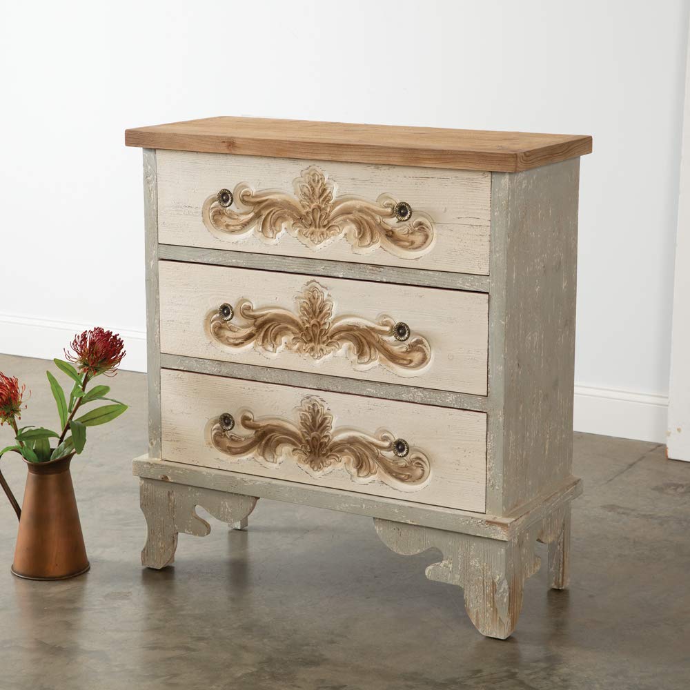The Genevieve chest is a small chest that can be used as a dresser or accent chest in any room. It has three safety drawers with intricate filigree and knobs.