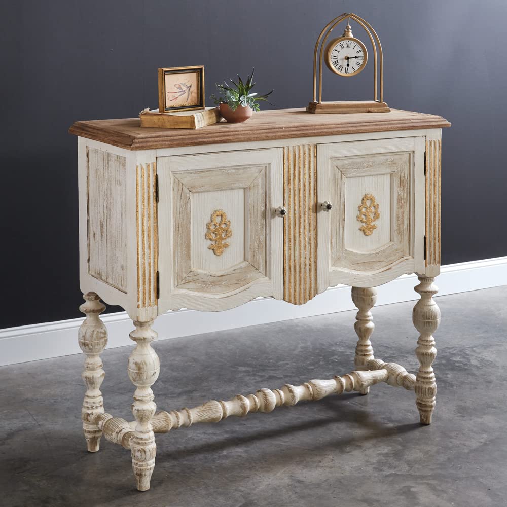 Influenced by antique pieces of furniture from the French provincial period this distressed console features intricate legs and neutral colors leaving an elegant touch wherever it is placed