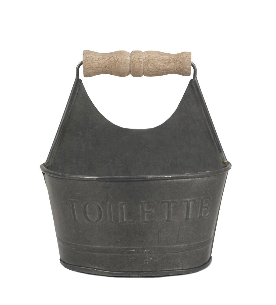 Keep your bathroom tidy with this small metal tin toiletries bathroom caddy. Use it for cotton balls swabs makeup and more. Made to look rustic with farmhouse style and features a lovely wooden handle and the word Toilette on the front. This caddy is divided into two sections so you can use it for multiple items. It measures: 5 x 4.5 x 3.5 inches.