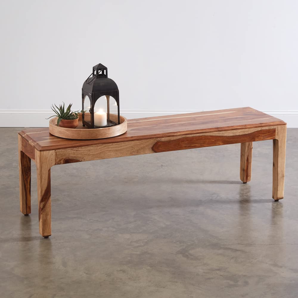 Pared-down lines and beautiful wood grain and texture defines this simple yet sophisticated bench. This piece is hand-crafted from sturdy mango hardwood. Real wood is a product of nature and as such no two pieces are alike. Variations in grain patterns and color are to be expected and help create a beautiful and unique one-of-a-kind piece. This item comes fully assembled. This item ships by motor freight. This item is not available for our dropship program.