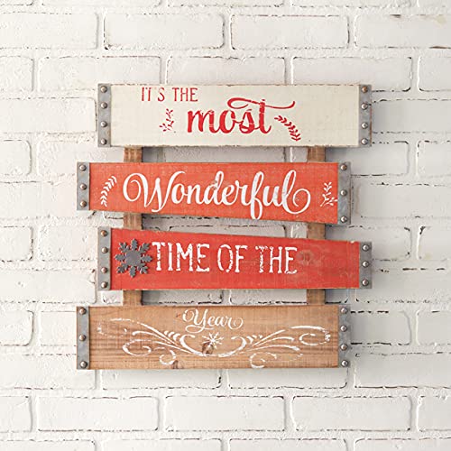 Spread cheer in the most wonderful time of the year with this planked sign. This item is made of wood with metal edges and rivets. To hang use its two triangle hangers. SKU: 530441 Measurement: 18¾''W x ¼''D x 17¾''H UPC: 801106205623
