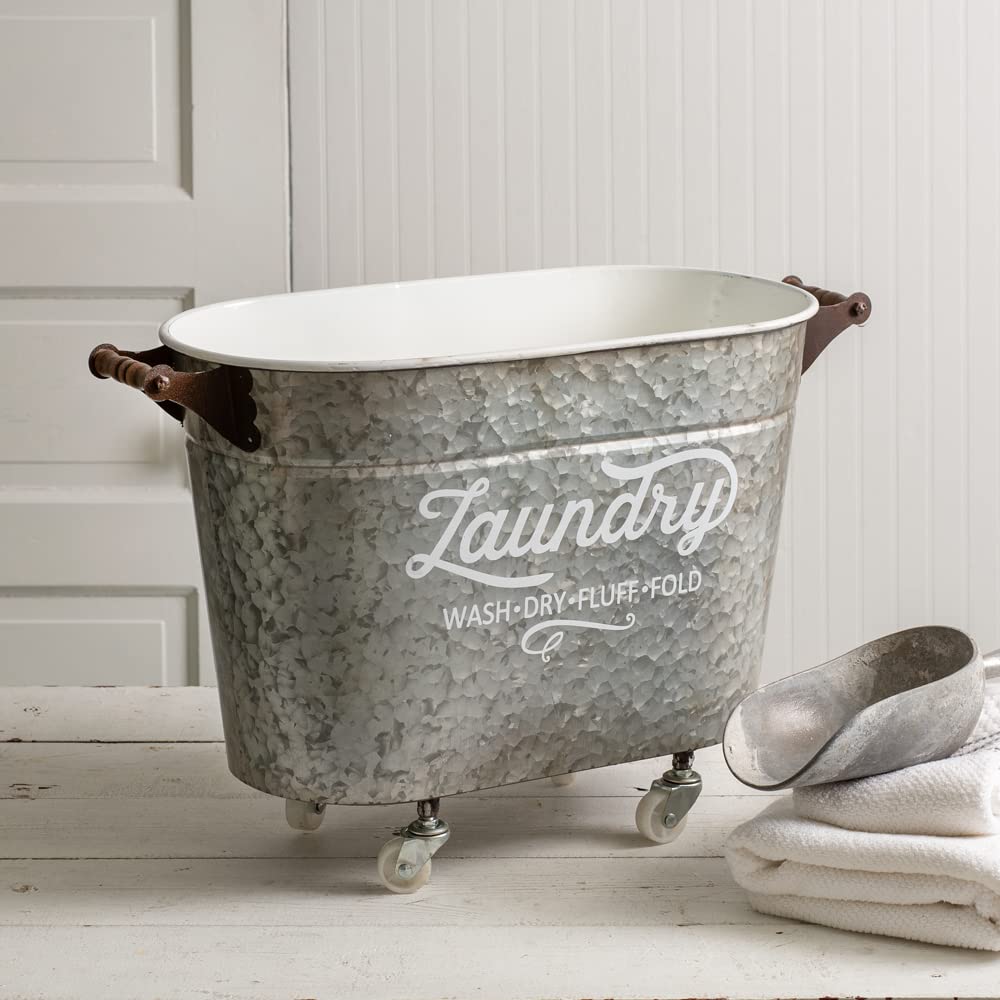 This laundry bin has wheels for moving around or it can be carried with handles on the sides