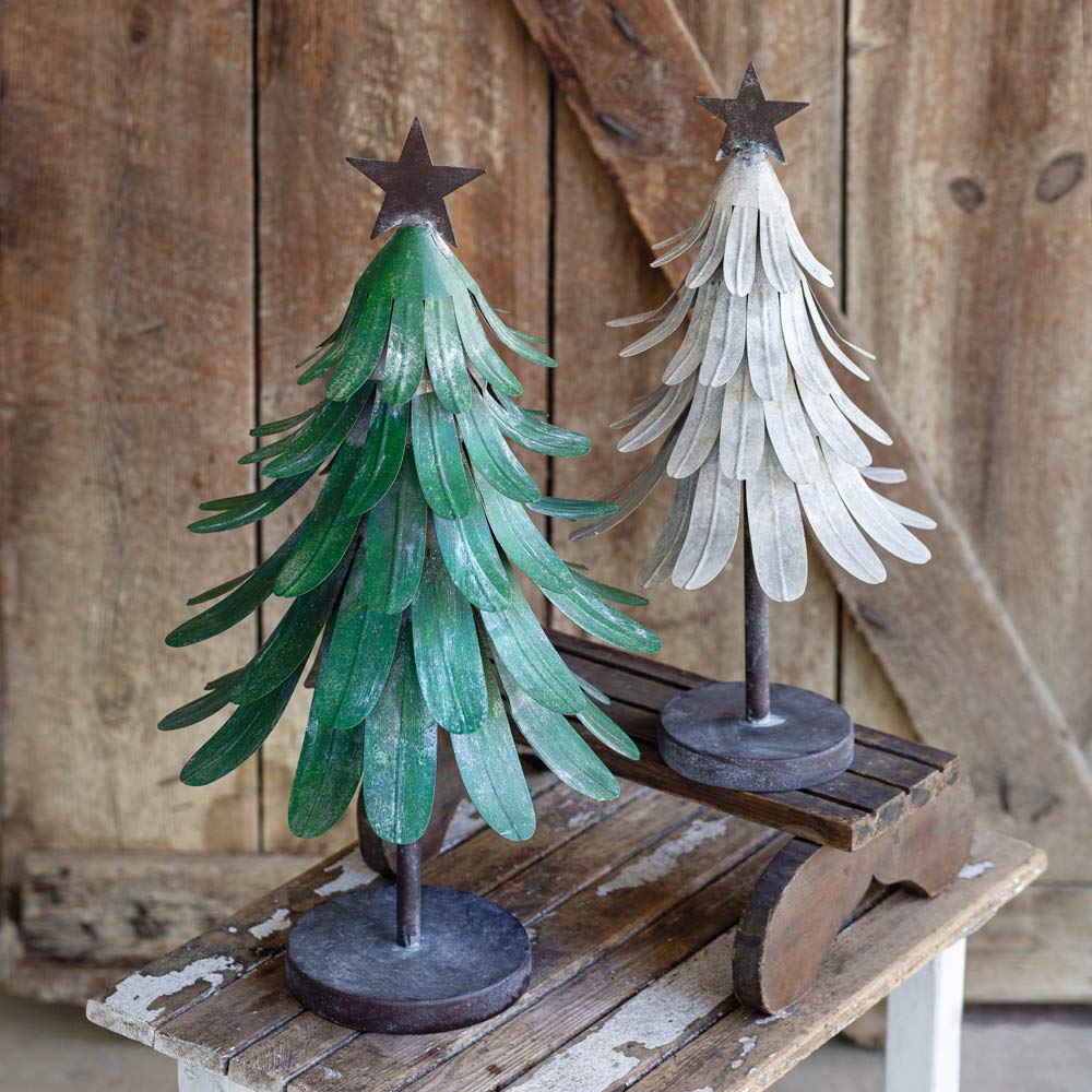 This rustic set of Christmas trees will add the perfect touch to any holiday setting. The large measures Largest is 11'' dia. x 21¼''H and the small measures 8'' dia. x 17¼''H. SKU: 770378 Measurement: Largest is 11'' dia. x 21¼''H UPC: 801106195894
