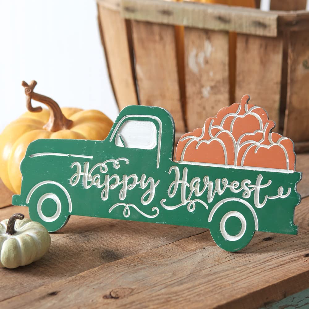 This rustic truck will bring a farmhouse style to your fall decorations. It features a truck filled with pumpkins with the phrase ''Happy Harvest.'' It has a kickback stand to easily display this item on a countertop. Item is 3½''D when stand is open.