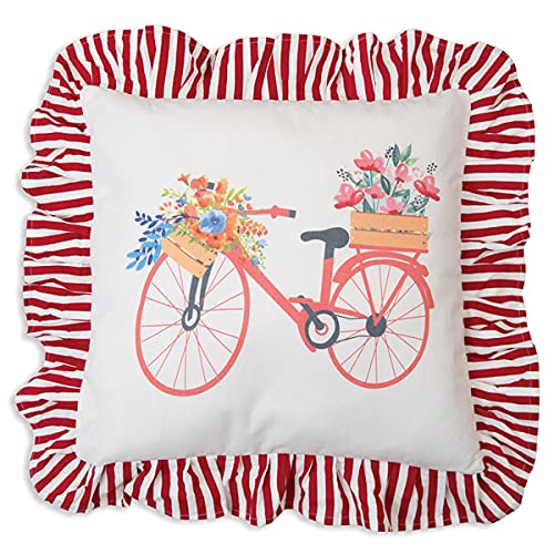 This throw pillow is 100% cotton with a poly fill and zipper closure. The pillow is surrounded with a 3'' cotton ruffle. SKU: 780216 Measurement: 18'' x 18'' UPC: 801106201762