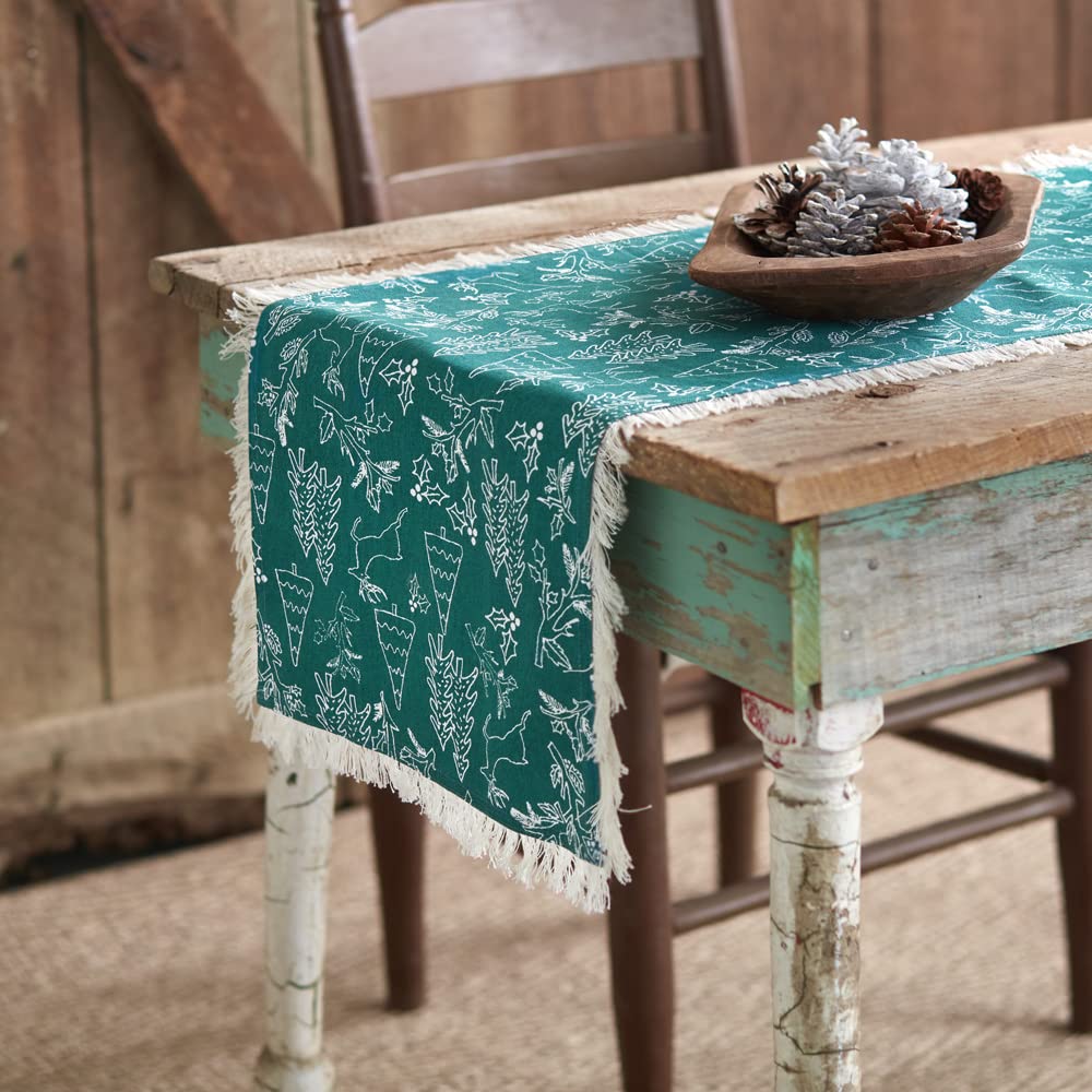Add some charm to your holiday tabletop with our Festive Green Christmas Table Runner. It features a fun holiday print of reindeer trees and holly and is lined with fringe. Made from 100% cotton. Hand wash only.