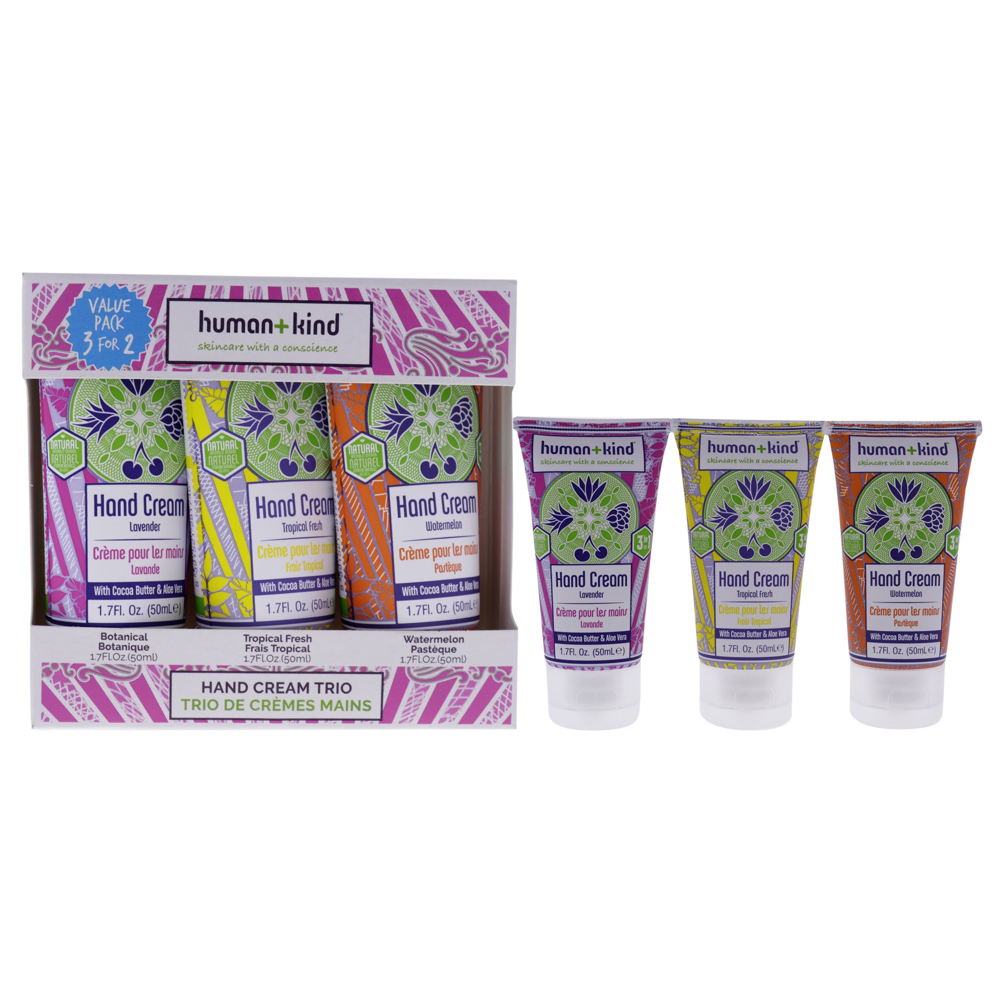The Hand Cream Trio by HumanKind offers three luxurious 17oz hand creams in Watermelon, Tropical Fresh, and Lavender scents. Perfect for keeping hands soft and moisturized throughout the day.