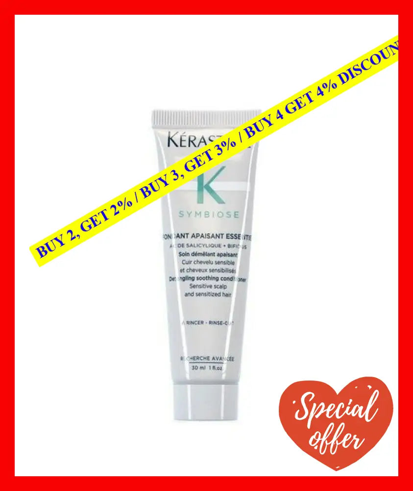 Features: Brand: Kerastase Gender: Unisex Category: Cosmetics Type: Hair Mask Size: 30ml Fondant Apaisant Essentiel from the Kerastase Symbiose range is a soothing, detangling treatment for sensitive scalp prone to dandruff. Its formula is free from silicones and sulfates. Its creamy and light formula soothes and preserves the scalp and moisturizes the lengths. Scalp sensitivity is reduced from the first application and over time. Hair is revitalized according to 94% of consumers. They are 96% more hydrated and plumped without adding weight. They're also 96% stronger. These results are possible thanks to its unique formulation, enriched with salicylic acid and bifid. Note: Salicylic acid eliminates dandruff present on the scalp. The bifidus rebalances the flora of the scalp and restores the hydration of the fiber for nourished and healthier hair. Ingredients: aqua / water / eau . cetearyl alcohol. glycerin . isopropyl myristate. parfum / fragrance . stearamidopropyl dimethylamine. glycine soja oil / soybean oil . helianthus annuus seed oil / sunflower seed oil . coco-caprylate/caprate . cetyl esters. caprylyl glycol. sodium benzoate. tartaric acid. limonene. salicylic acid. squalane . bifida ferment lysate. hydroxypropyl guar hydroxypropyltrimonium chloride . benzyl salicylate. benzyl alcohol. linalool . citronellol. citral . geraniol. artemisia umbelliformis flower extract. phenoxyethanol. citric acid. potassium sorbate
