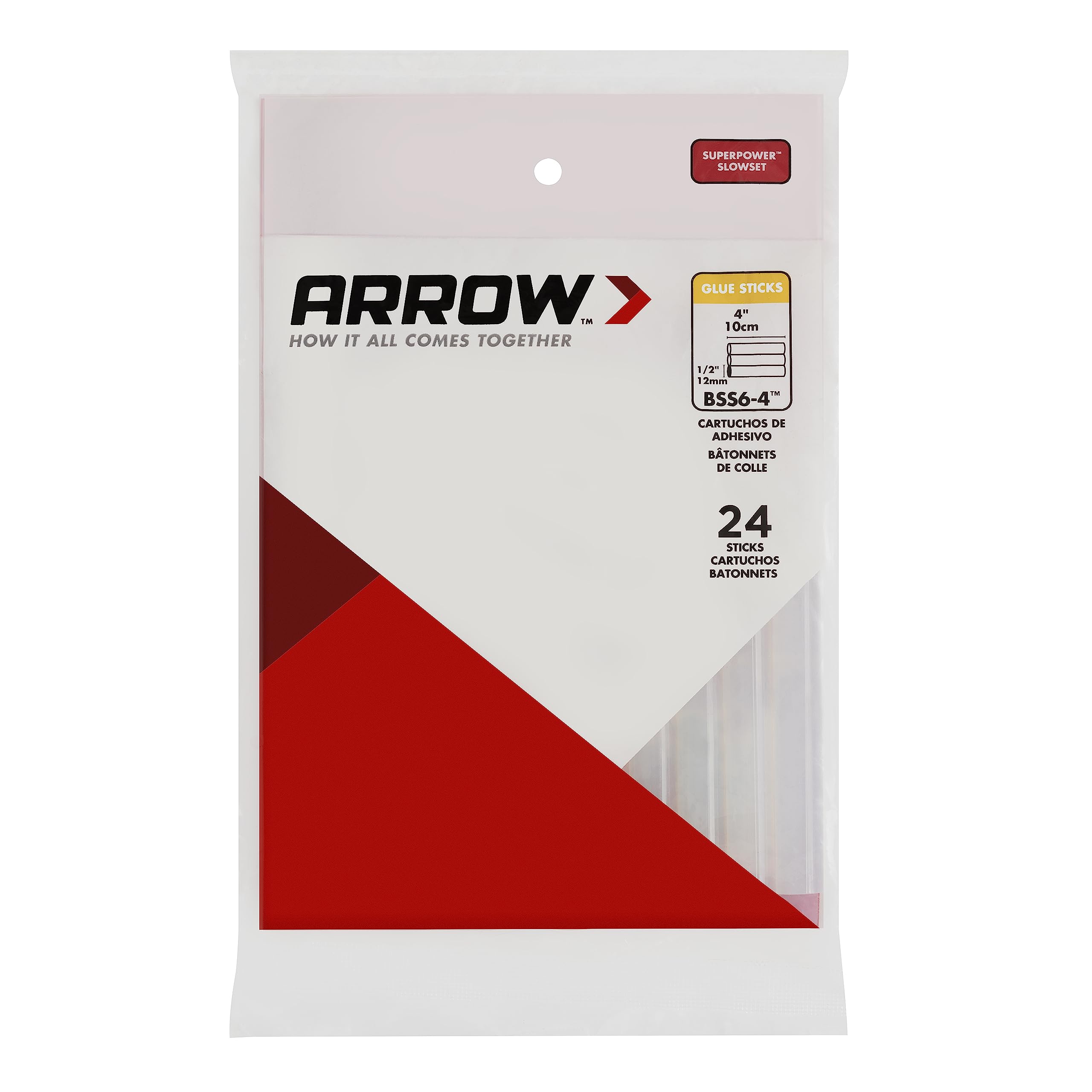 Product DescriptionThe Arrow Fastener 4-inch superpower slow set glue sticks allow more time for lineup on larger areas than other glue sticks. Use them on wood, metal, plastics, leather, fabrics, etc. Perfect for arts and crafts, and hobbies. The glue sets in 90 to 120 seconds. Each bag contains 12 glue sticks.From the ManufacturerThe Arrow Fastener 4-inch superpower slow set glue sticks allow more time for lineup on larger areas than other glue sticks. Use them on wood, metal, plastics, leather, fabrics, etc. Perfect for arts and crafts, and hobbies. The glue sets in 90 to 120 seconds. Each bag contains 12 glue sticks.