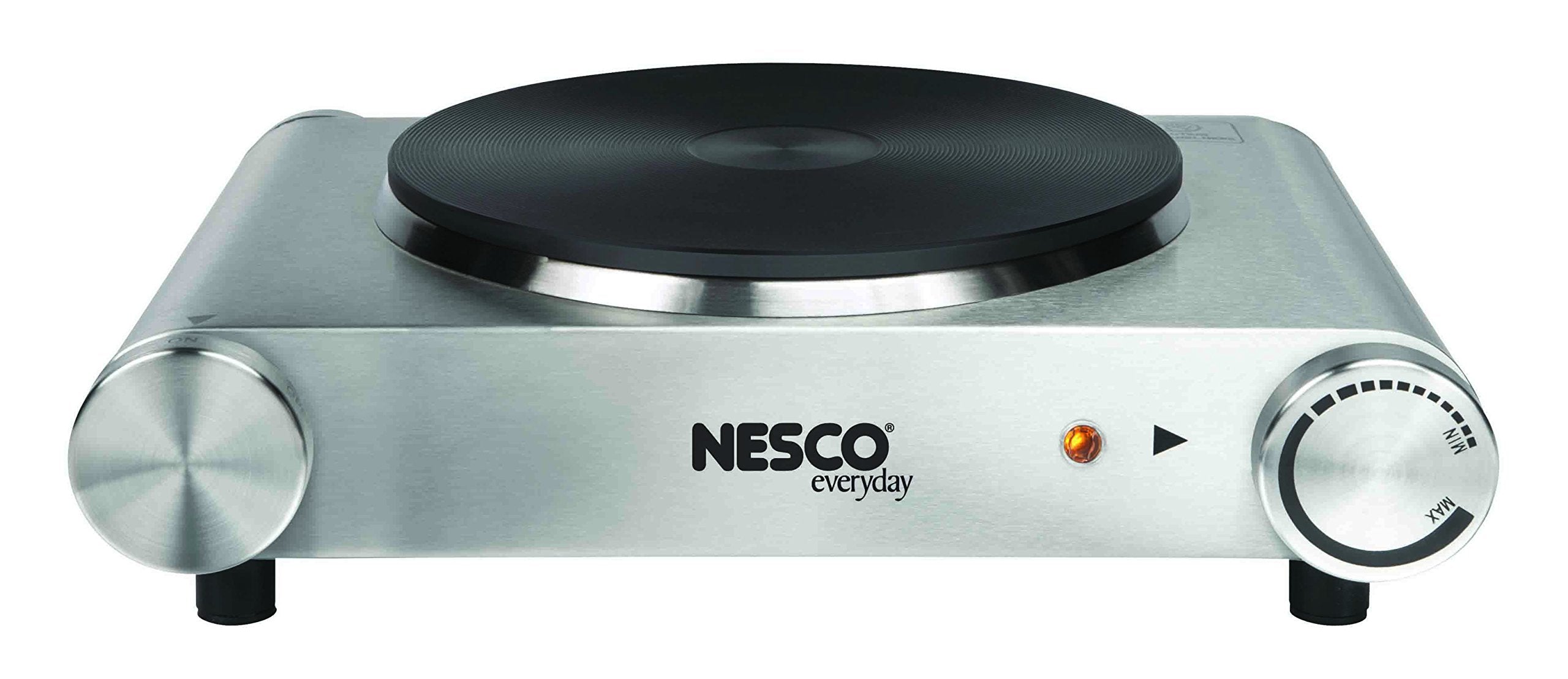 The Nesco SB-01 Electric Burner is great for simmering, boiling, frying or sautéing for preparing meals when camping, boating or to use in college dorms! The electric burner has a high quality cast iron plate, 7.4-Inch in diameter. The burner can be used with all flat bottom cookware, including metal, glass, ceramic, woks and teakettles. The unit features stainless steel housing, automatic safety shut-off and thermostat control knob with pilot light. The thermal fuse helps protect from overheating. 1500 Watts.