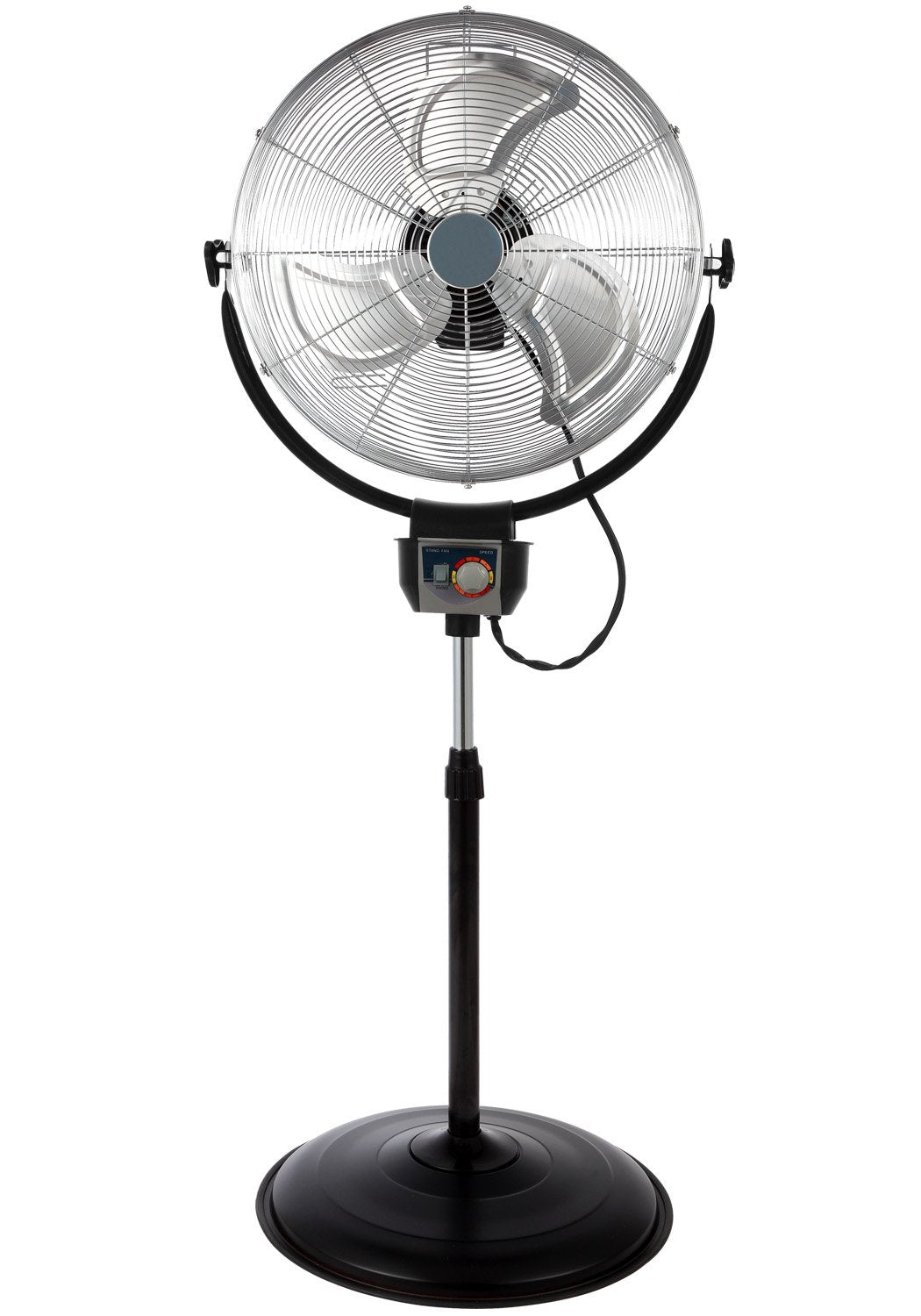 Need big cooling on the go? The Optimus 3-Speed 20-In. Industrial-Grade High-Velocity Oscillating Stand Fan is a smart, safe, and convenient way to cool down during hot summer months. It features a powerful high-torque motor, all-metal construction, adjustable height, and a heavy-duty aluminum 20-in blade. The head tilts up to 360° so you can achieve max air circulation while the fan itself provides 75° of oscillation and the stable base keeps the fan firmly in place. The reinforced chrome wire grille keeps objects away from the blade. This high-velocity oscillating stand fan is ideal for fast, space-cooling relief in garages, shops, warehouses, exercise rooms, and outdoor workspaces and patios.